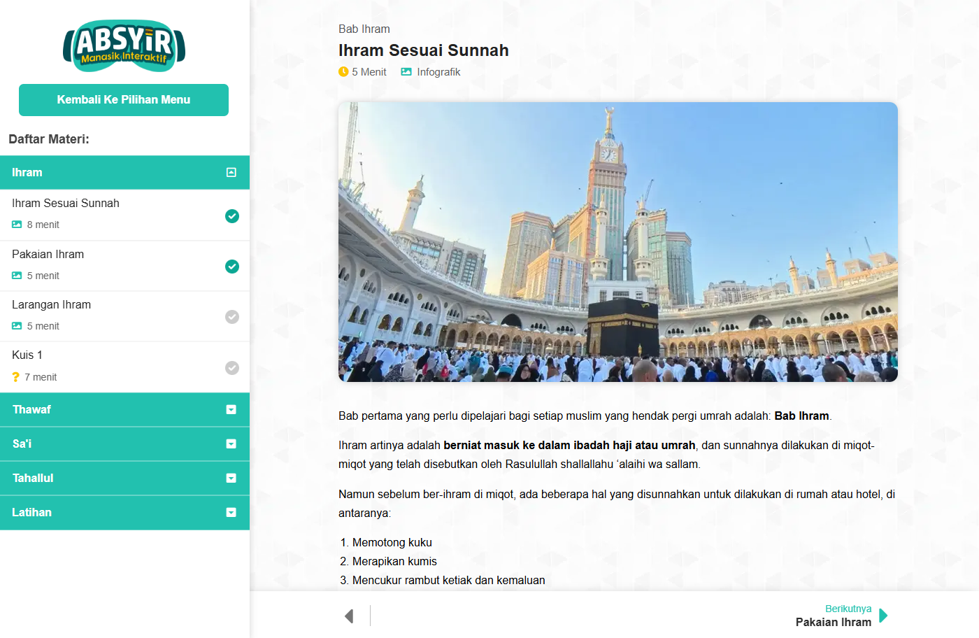 Karena Absyir menggabungkan materi fikih manasik dengan teknologi interaktif seperti video, audio, infografis, hingga simulasi 360°/VR, jadi belajar bisa lebih cepat dipahami.
